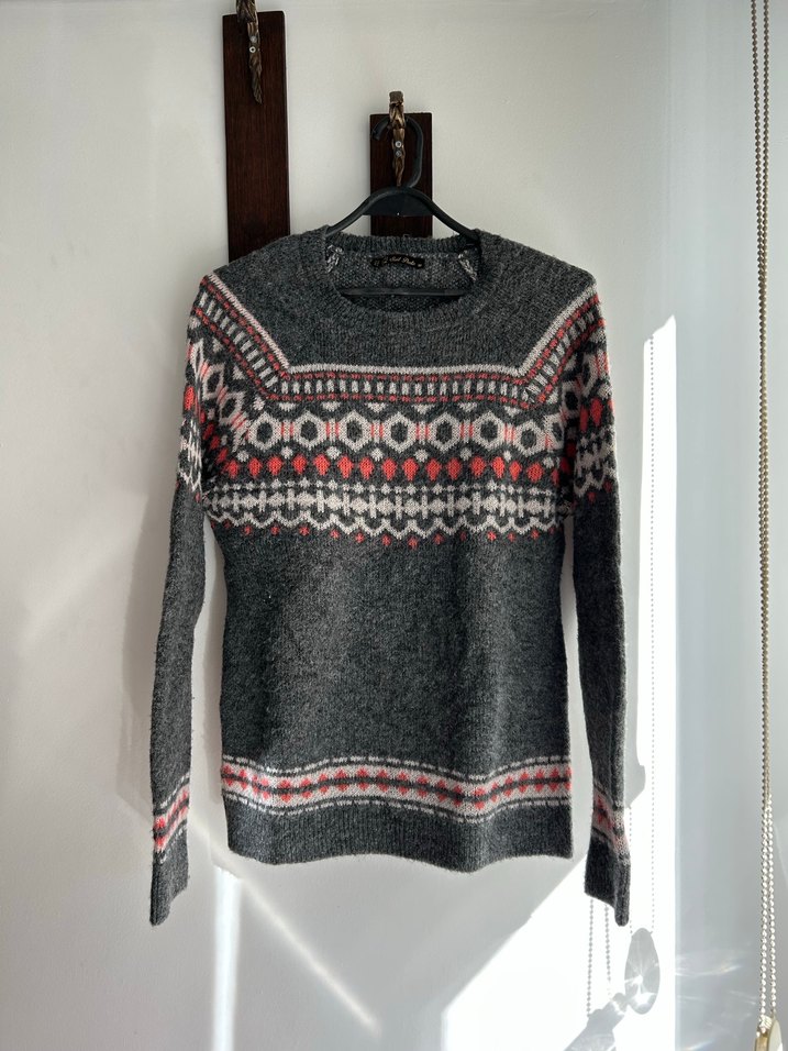 Örgü yün kumaştan, yuvarlak yaka ve uzun kollu bohem tarzda, desenli gri kazak. Ürünü hiç giymedim. Kusuru yok.