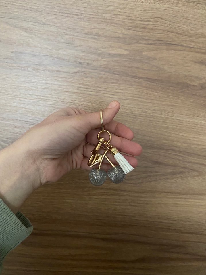Altın renkli, gri püsküller ve dekoratif boncuklar içeren bohem ve minimalist tarzda kadın anahtarlık. Retro ve hippie stiller için uygun.