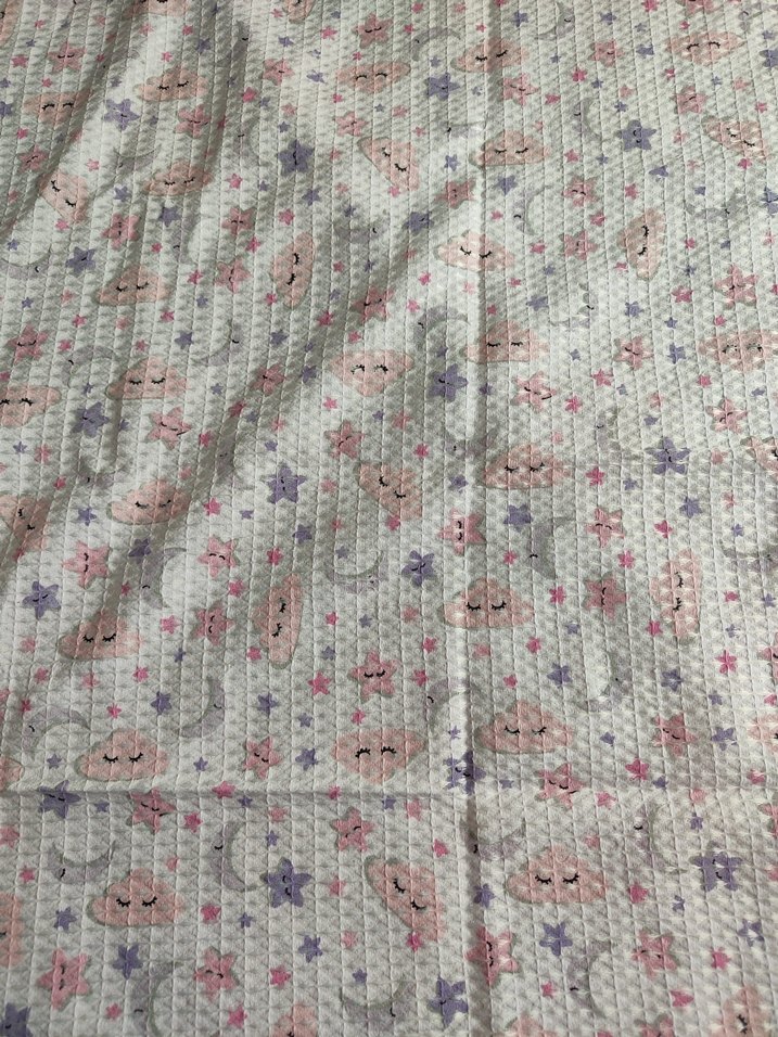 Hafif gri renkte, yumuşak pembe ve mor tonlarında soyut bohem desenli, dokulu kumaştan yapılmış bebek pikesi