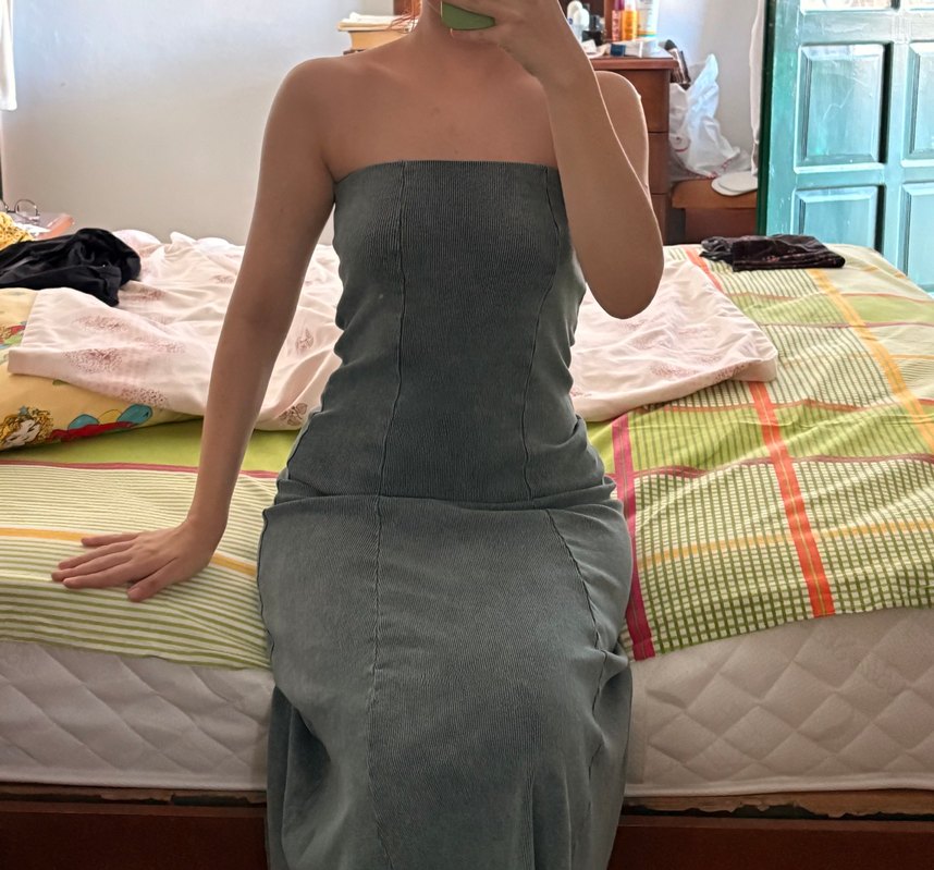 Gri-haki renkte, straplez yakalı ve drapeli detaylara sahip, yumuşak denim kumaştan yapılmış, vücuda oturan midi boy bohem elbise. beyaz gömlekle çok güzel oluyor