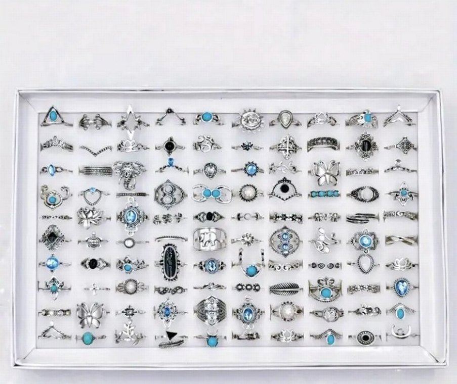 Bohem tarzda, gri ve turkuaz boncuklu desenli kadın yüzük seti, günlük kullanım için uygundur. adet fiyatıdır
