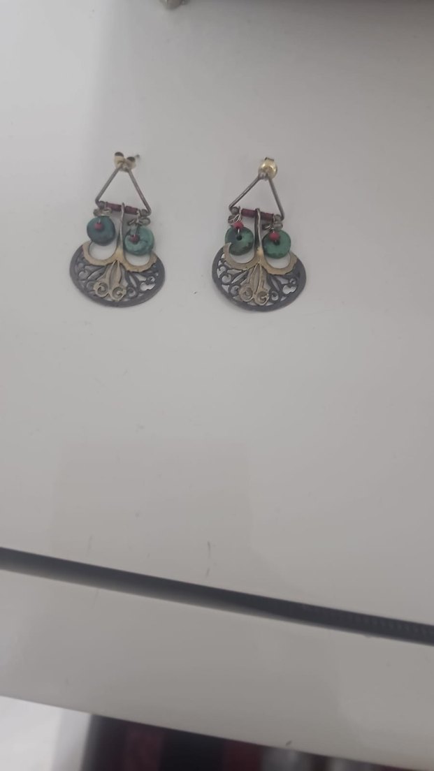 Mardin el işlemesi Kısa uzunlukta, boncuk detaylı turkuaz ve gri renkli, nakış desenli bohem küpeler. Günlük kullanım için uygun, vintage tarzda.