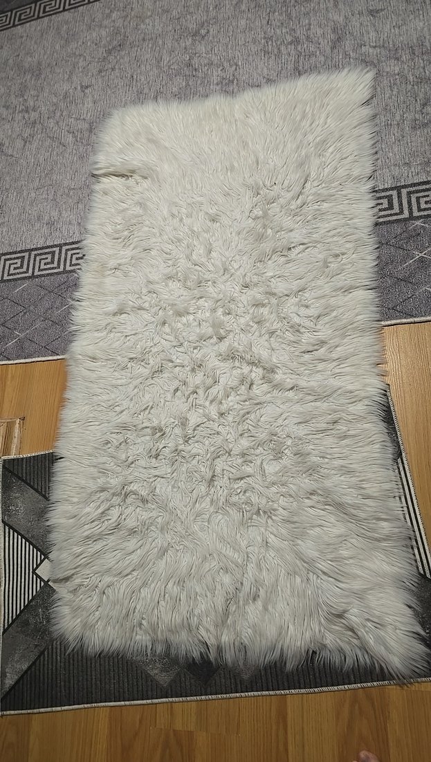 Bohem tarzda, gri renkte yumuşak ve tüylü dokulu, desensiz halı. Her odaya sıcaklık katıyor.