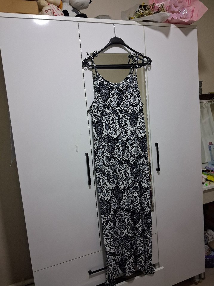 Bohem tarzda, askılı yaka ve vücuda oturan kesimle gri uzun elbise. Dantel desenlidir ve yumuşak sentetik kumaştan üretilmiştir. Günlük kullanım için uygundur. TEMSİLİ MARKA