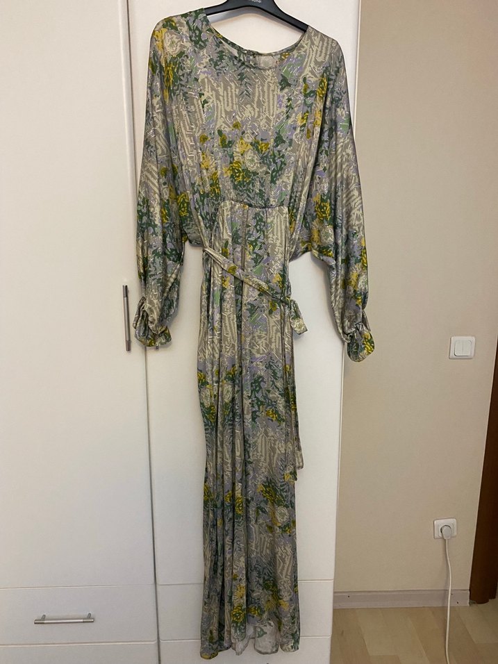 Kadınlar için gri renkli, bol kesim, drapeli uzun elbise. Straplez yakalı ve sentetik yumuşak kumaştan üretilmiştir, bohem tarzını yansıtır.