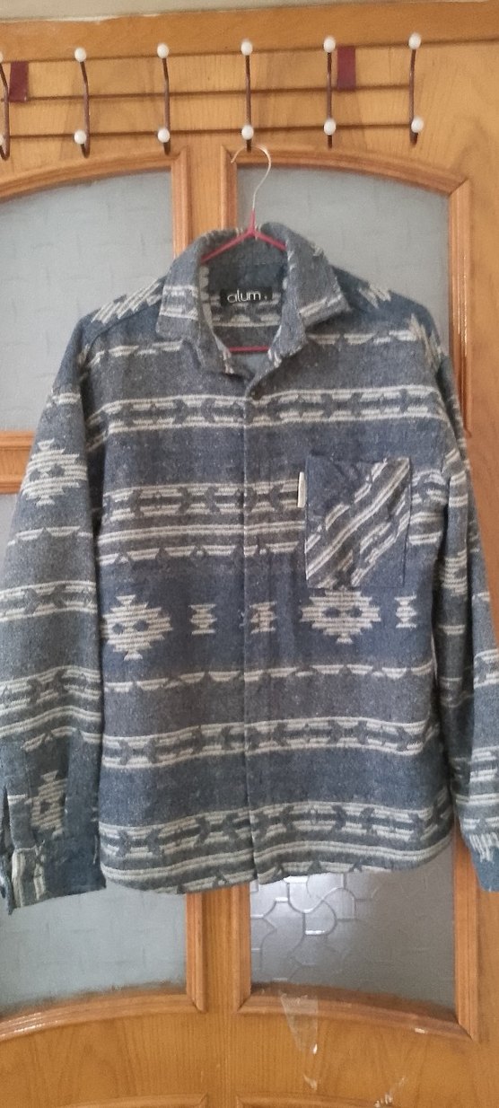 Yumuşak yün kumaştan yapılmış, düğmeli ön ve yakası açık bohem tarzda, bol kesim gri desenli uzun kollu erkek gömleği. Günlük kullanıma uygundur.