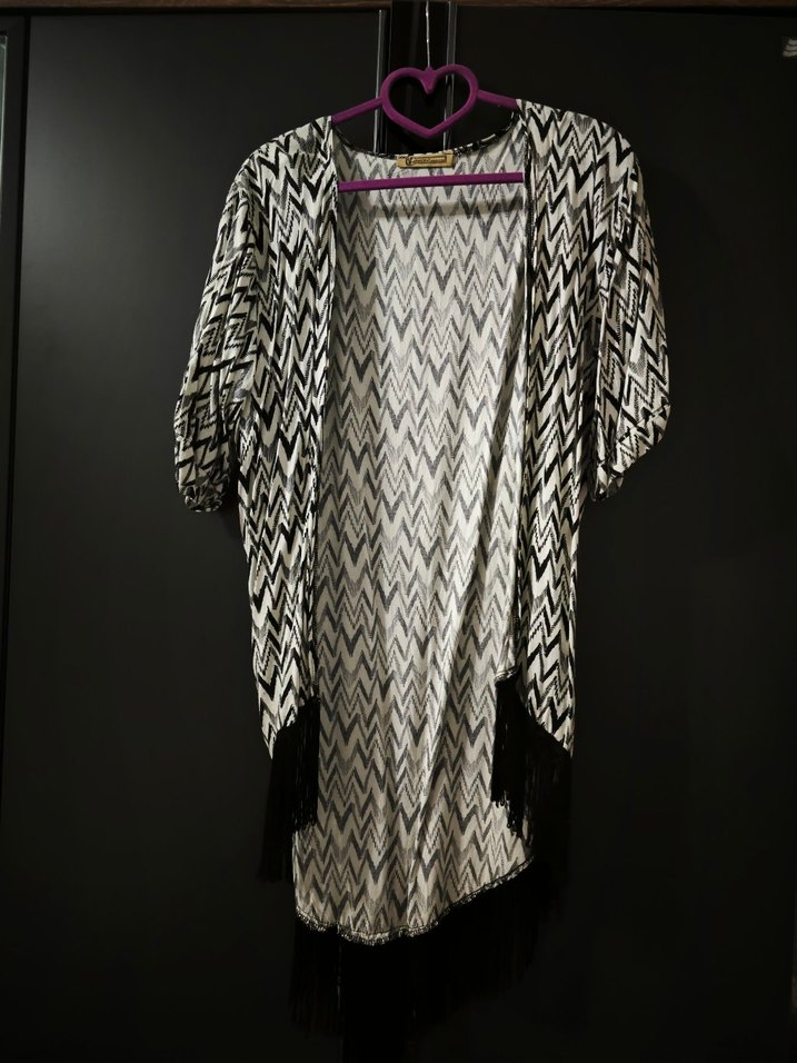 Gri tie-dye desenli, uzun kollu, V yaka, salaş kesim midi kimono, bohem tarz için uygun. standart beden