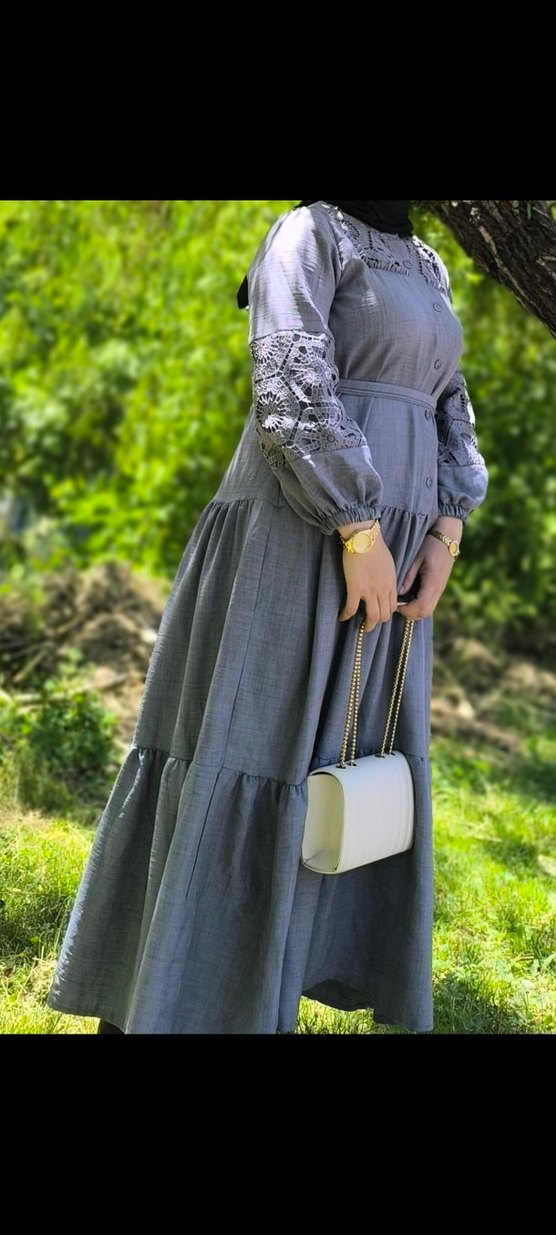 Bu uzun gri elbise, yüksek yakalı ve nakış işlemeli uzun kollara sahiptir. Bol kesim ve fırfır detayları ile bohem bir tarz sunar. Sentetik kumaştan üretilmiştir ve günlük kullanım için uygundur.