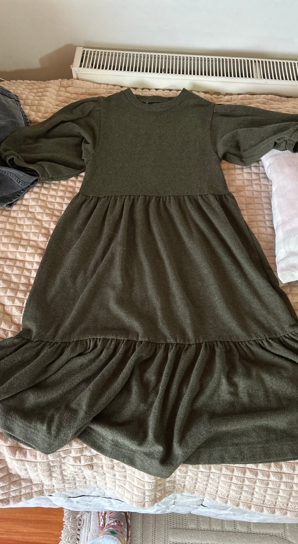 Bohem tarzda, uzun kollu ve yuvarlak yakalı salaş kesim elbise. Yumuşak keten kumaştan, gri renkte, rahat kullanım için uygun.