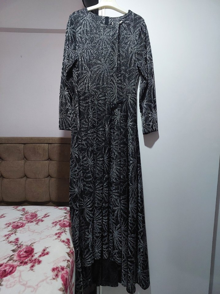 Kayık yaka,esnek ve simli kumaş. 40-42 beden abiye. Kendinden kemerli. 1 kere kullanildi.