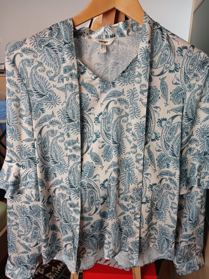 Bohem tarzı, uzun kollu, V yakalı, bol kesim gri baskılı gömlek. Yumuşak dokulu kumaştan, drapeli detaylı.