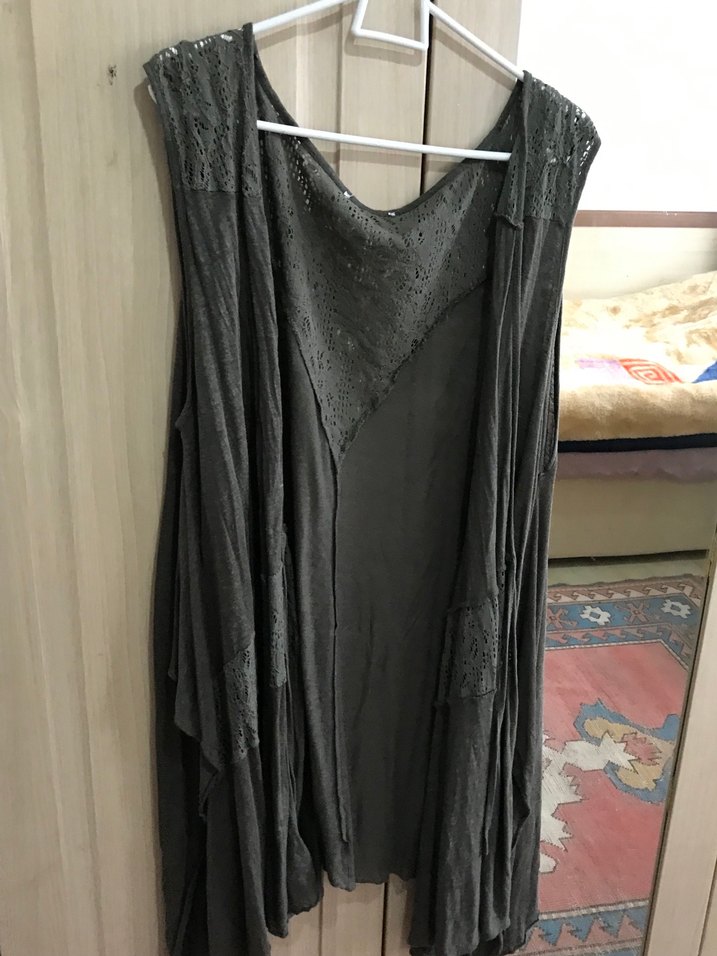 Gri, kolsuz, uzun kesim keten kumaştan yapılmış, V yaka ve dökümlü tasarıma sahip bohem tarzda bol kesim yelek.