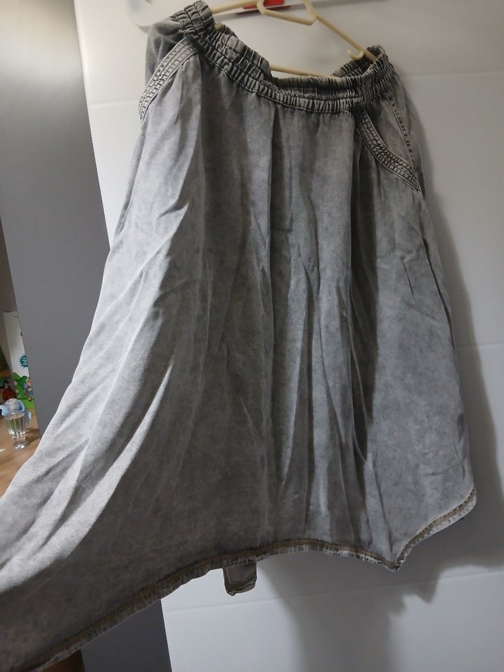 Bohem tarzda, gri renkte, keten kumaştan, bol kesim ve drapeli uzun etek. Rahat ve günlük kullanıma uygun. asimetrik kesim ince kot yumuşak kumas polo
