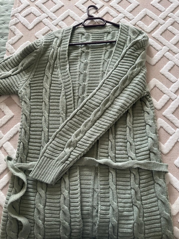 Bohem tarzda, gri uzun örgü hırka, bol kesim ve boğazlı yaka ile rahat ve şık bir görünüm sunar.