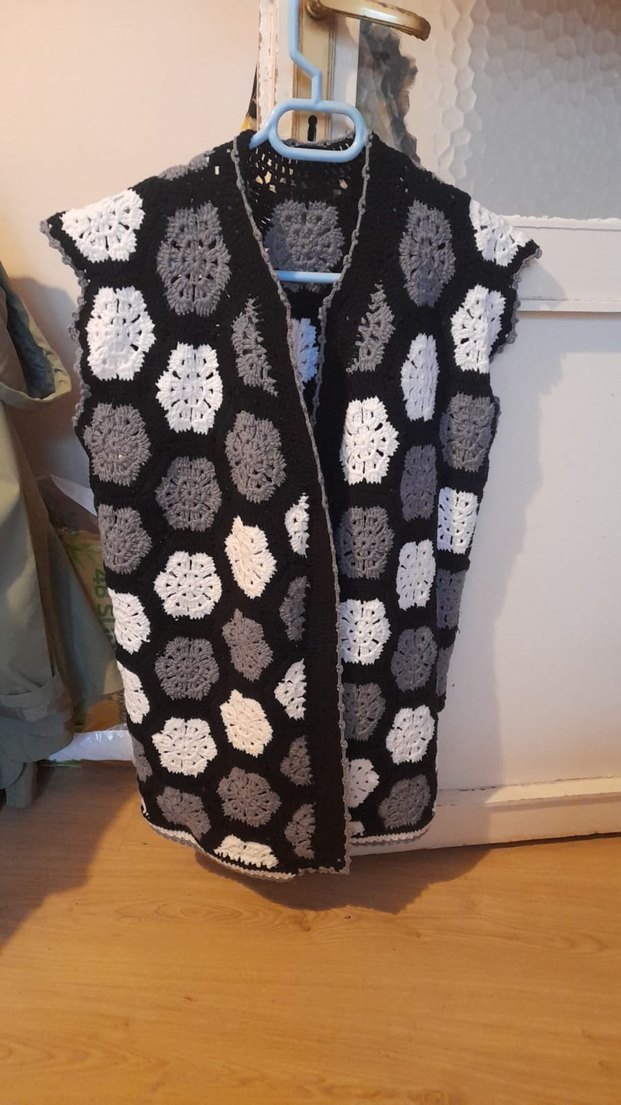 Uzun, gri örgü yelek, bol kesim ve kolsuz. Desenli bohem tarzı ve boğazlı yaka ile rahat bir görünüm sunar.