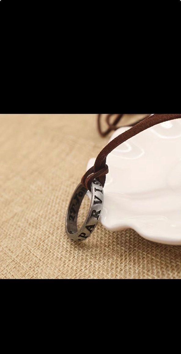 Bu erkek kolye, kahverengi deri ip ve üzerinde yazılı harfler bulunan gri metal halkadan oluşur, minimalist bohem tarzı yansıtır.