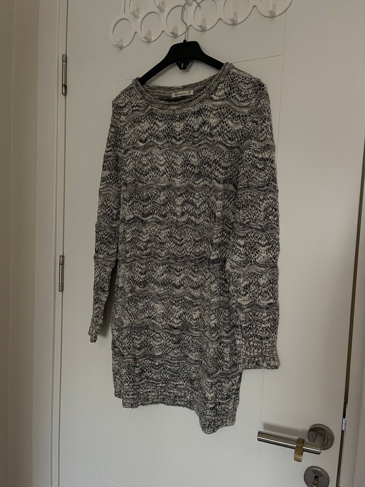 Gri renkte, yılan desenli uzun örgü kazak, bol kesim ve yuvarlak yaka detaylarına sahiptir. Rahat ve bohem tarzıyla günlük kullanıma uygundur.