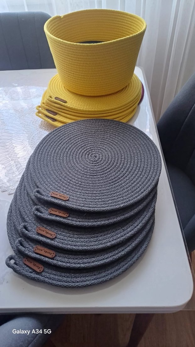 Bohem tarzda, dokuma gri yuvarlak Amerikan servis seti. Her parçada küçük deri etiket detayı bulunur.