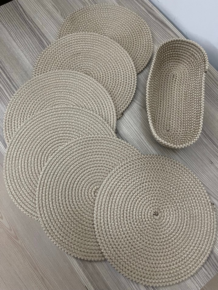 Bohem tarzda gri yuvarlak örgü amerikan servisler ve uyumlu tepsi, sofranıza doku katmak için ideal.