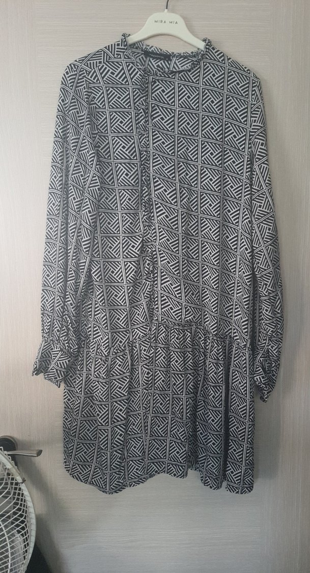 Gri zebra desenli, pileli detaylara sahip uzun tunik. Bol kesim, uzun kollu ve tekne yaka, yumuşak sentetik kumaştan bohem tarzda.