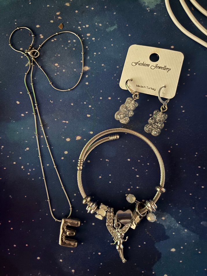 Bohem tarzı, gümüş renkli boncuklu kolye, harf kolye ucu, bileklik ve ayıcık figürlü küpelerden oluşan takı seti. Günlük kullanıma uygun. ✨