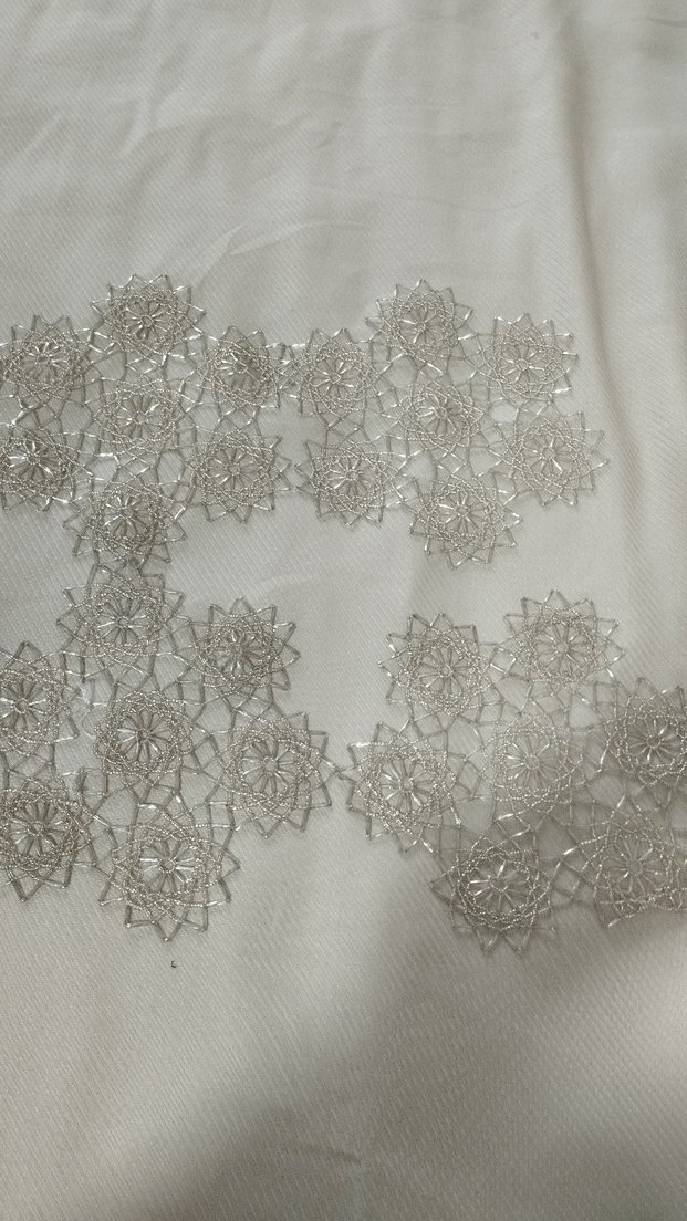 Gümüş renkli, ince bohem işlemeli dantel. Zarif çiçek desenleriyle el işçiliği hissi veren bir parça.