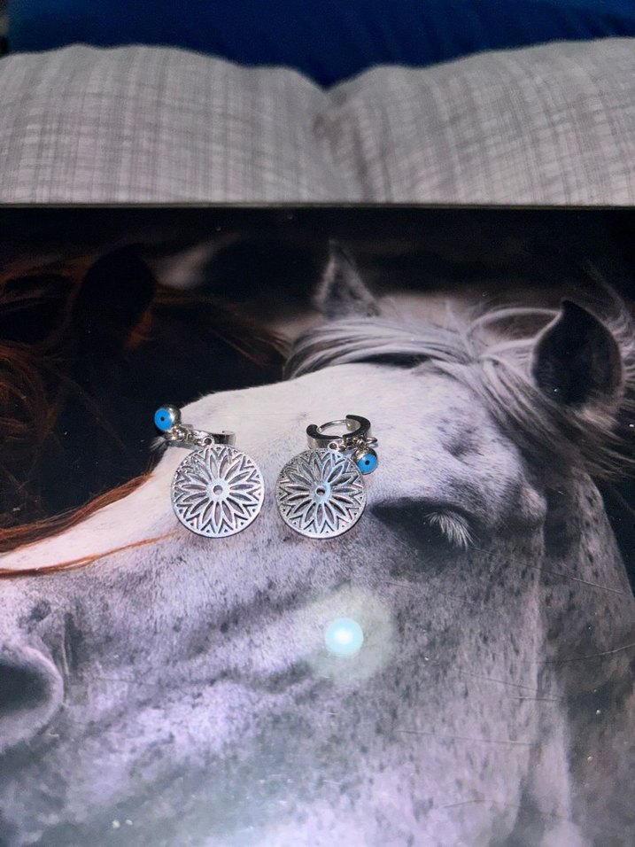 Çiçek desenli ve turkuaz detaylı gümüş renkli bohem küpe, retro ve hippie tarzına uygundur.