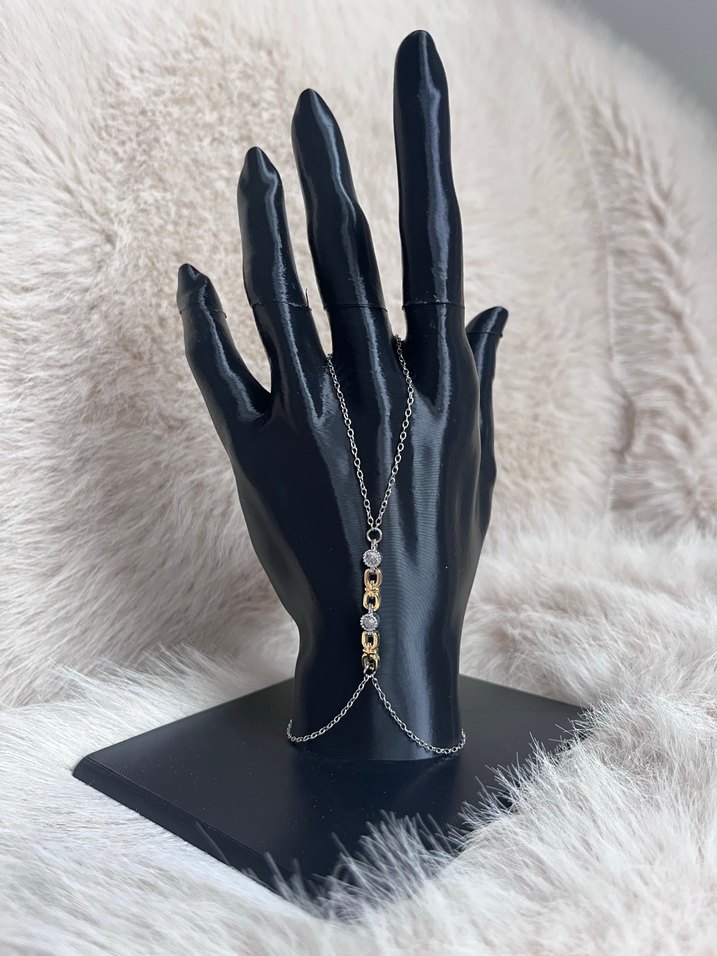 Bohem tarzı kadın el zinciri, altın detaylı ince gümüş zincirle günlük kullanıma uygun ve avant-garde bir görünüm sunar.
