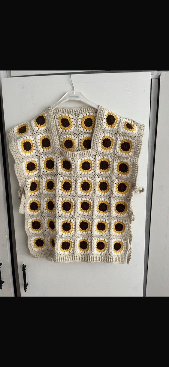 Bohem tarzda, gevşek kesim ve yuvarlak yakalı, örgü süveter. Günebakan desenleriyle rahat ve retro görünüme uygun. Motifli el örgüsü bohem süveter