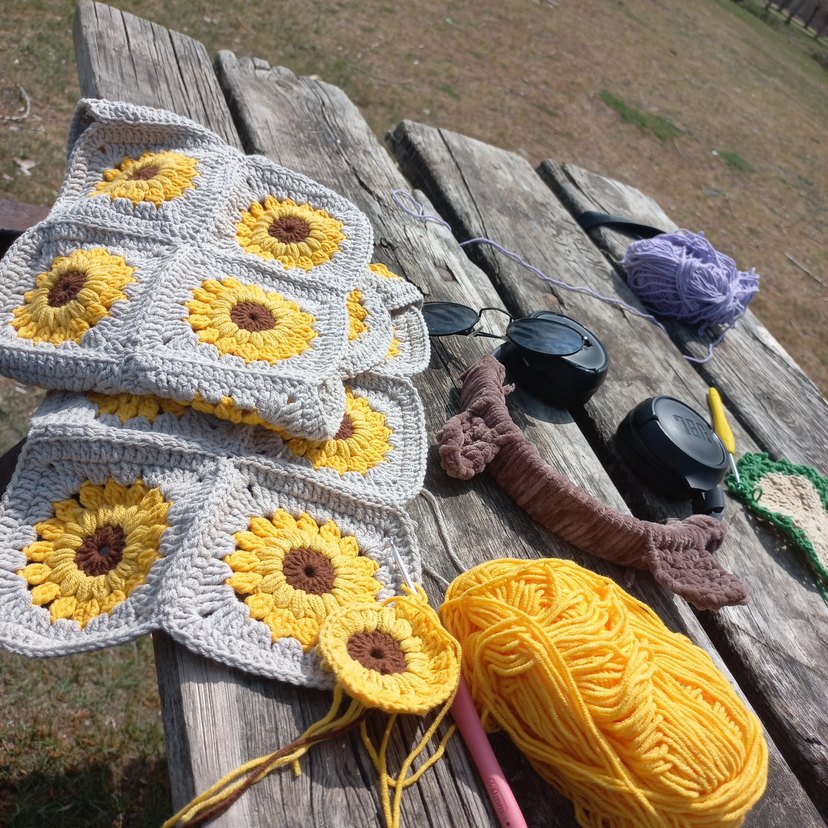 Yumuşak iplikten yapılmış, güneş çiçeği motifli bohem tarzda el örgüsü ürünler. Canlı sarı ve doğal tonlar sıcak bir görünüm sunar. motif adet olarak gönderilmektedir,renk seçimi size aittir