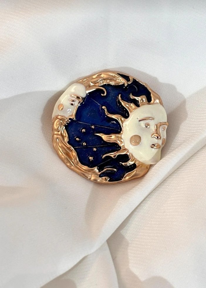 Koyu mavi renkte, güneş ve ay figürlü işleme detaylı bohem tarzı broş. Düğmeli kapanışıyla romantik akşamlar için uygun.