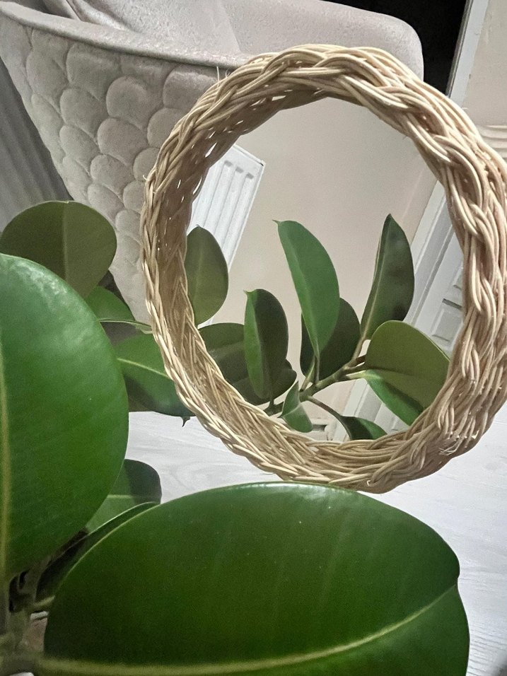 Doğal hasırdan el yapımı, bohem tarzda dekoratif çelenk. Mekanınıza rustik bir dokunuş katar. AYNA