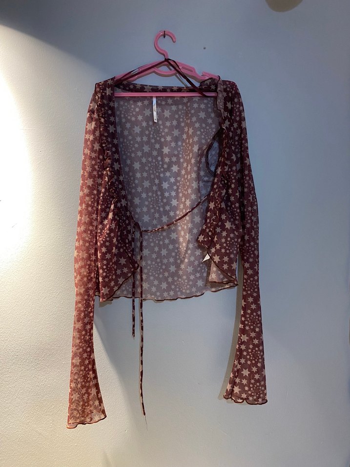 Bağlamalı, yıldız desenli bordo hırka. Tül kumaştan, dar kesim ve uzun kollu, bohem tarzda.