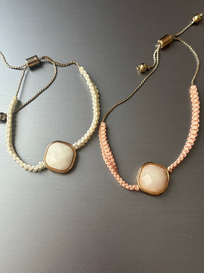 Pastel tonlarda boncuklu, bohem tarzda, ortasında parlak taş bulunan ve ayarlanabilir zincirli kadın bileklikleri.
