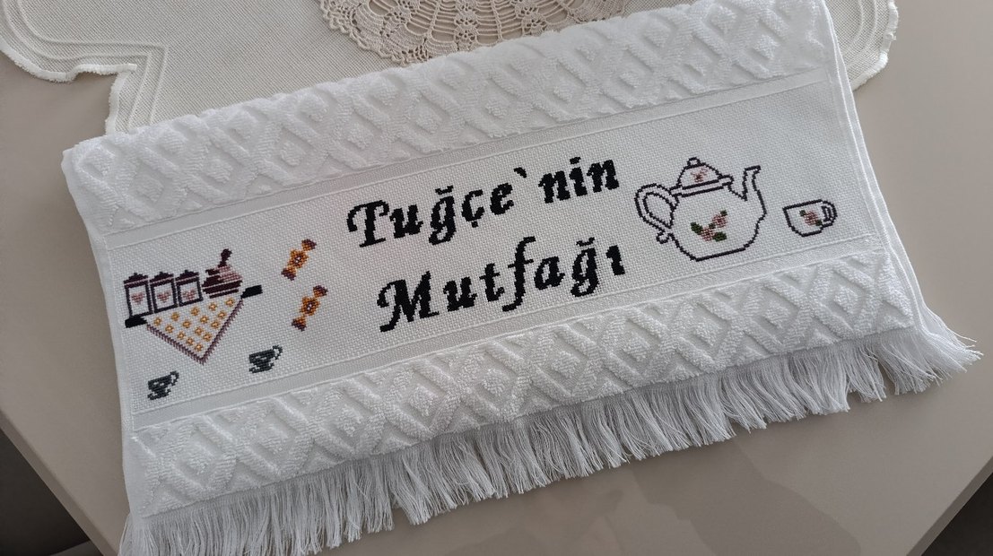 Tuğçe'nin Mutfağı yazılı, bohem tarzda işlemeli beyaz mutfak havlusu. Yumuşak dokulu ve püsküllü detaylara sahip. İsme özel işlenir..