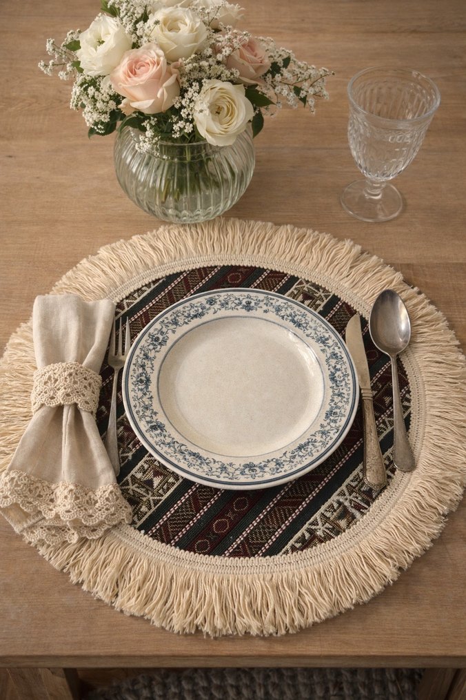 Bohem tarzda, püsküllü yuvarlak Amerikan servis. Supla