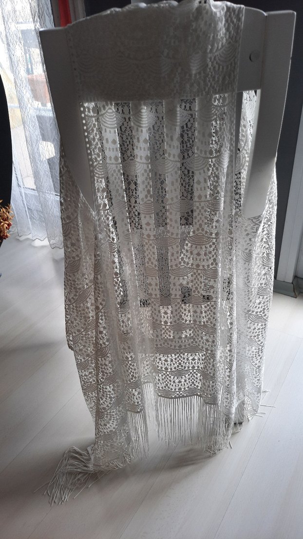 Bohem tarzda, beyaz işlemeli desenlere sahip, yumuşak ve hafif kumaştan yapılmış, alt kısmı püsküllü tül plaj kıyafeti