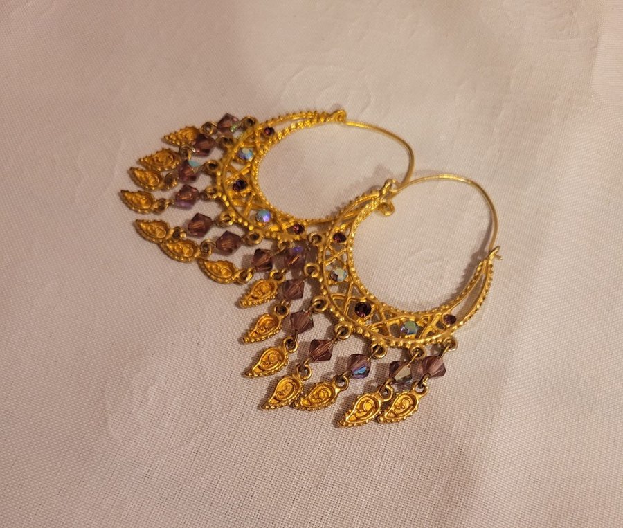 Düğünler için uygun, işlemeli detaylar ve boncuk süslemeleri olan altın renkli bohem küpeler. Normal uzunlukta ve midi tarzda.