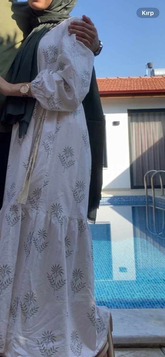 İşlemeli desenlere ve yüksek yakaya sahip uzun beyaz elbise. Rahat kesim ve drapeli tasarım, yumuşak sentetik kumaştan, ince askılı kollarla bohem ve sade bir görünüm sunar.