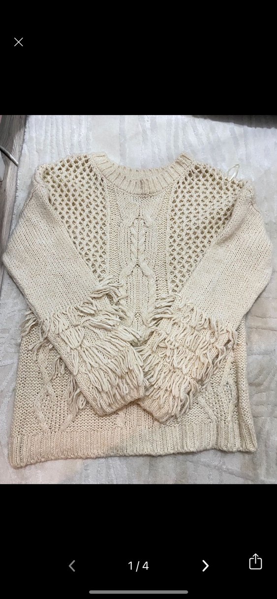 Bej renkli bu örgü kazak, bol kesim, uzun kollu ve yuvarlak yakaya sahiptir. Bohem tarzda, kol kısmında püsküllü detaylar bulunur. Günlük kullanıma uygundur.