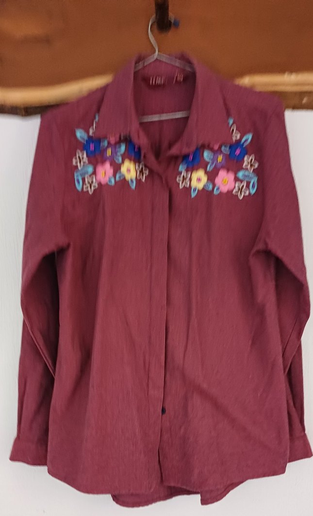 Bordo renk, uzun kollu, nakışlı çiçek desenli kadın gömlek. Yaka detaylı, düğmeli ve yumuşak kumaştan, bol kesimdir. Günlük kullanıma uygundur. yünlü kislik gomlek