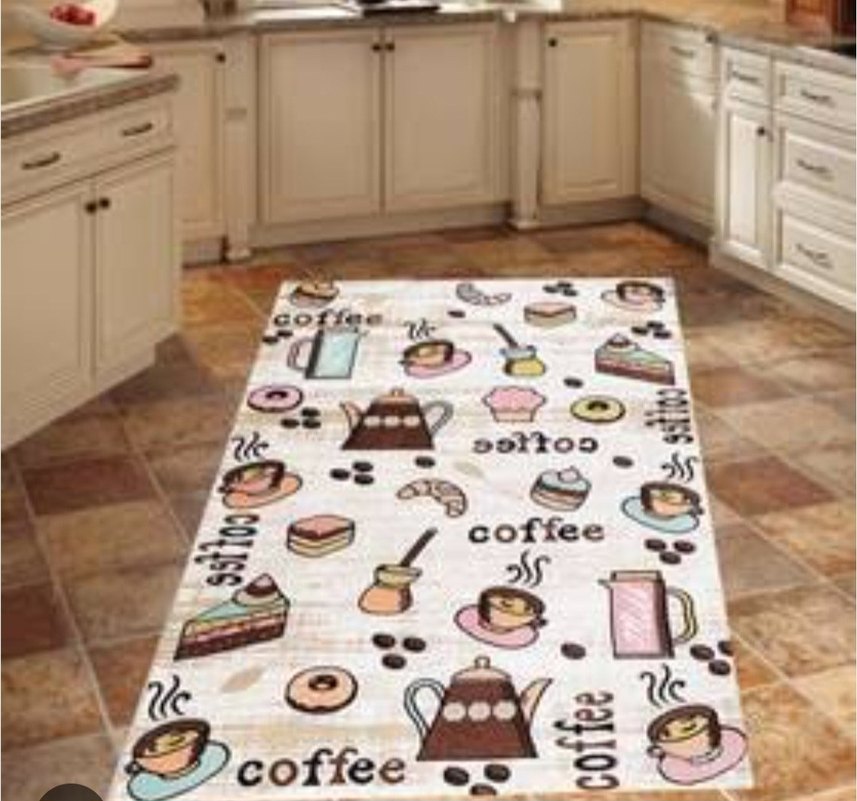 Açık kahverengi bohem tarzda, kahve temalı baskılı desenlere sahip halı. Fincan, çaydanlık ve tatlı desenleriyle sıcak ve eğlenceli bir görünüm sunar ☕. 160×230