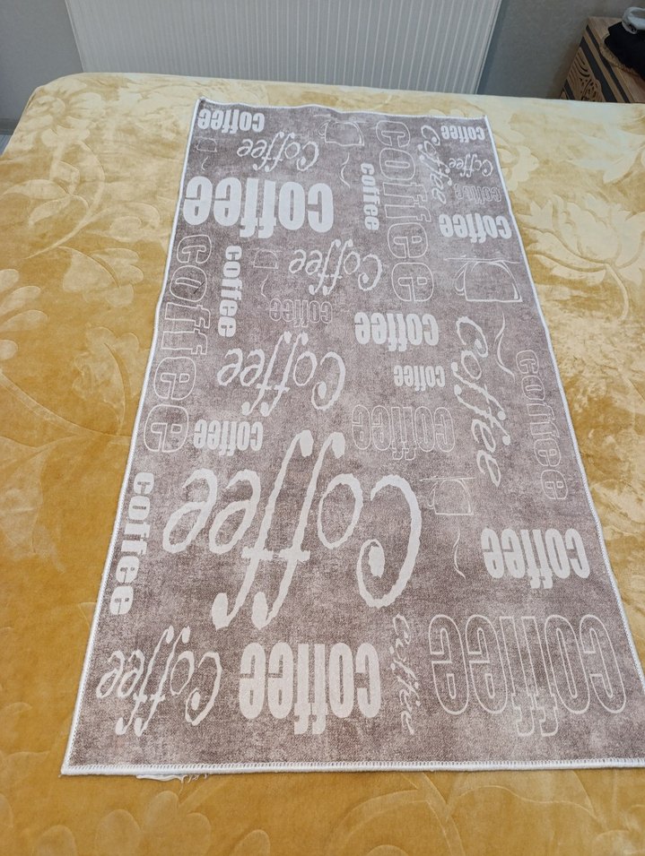 mutfak halisi Bohem tarzda, kahverengi ve gri renklerde, kahve temalı baskılı halı. Farklı yazı tipleriyle "coffee" yazıları yer alıyor. ☕