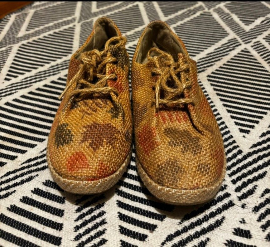 Birkaç kez kullanılmış, yeniden farksız temiz hasır ayakkabı. 39 yazıyor ama kalıbı 38. Bohem tarzda