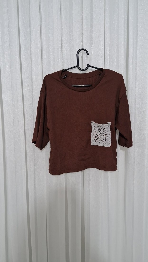 Bohem tarz kahverengi örme kumaştan kısa kollu, yuvarlak yakalı, bol kesim bluz. Örgü cep detayıyla sade ve şık bir görünüm sunar.