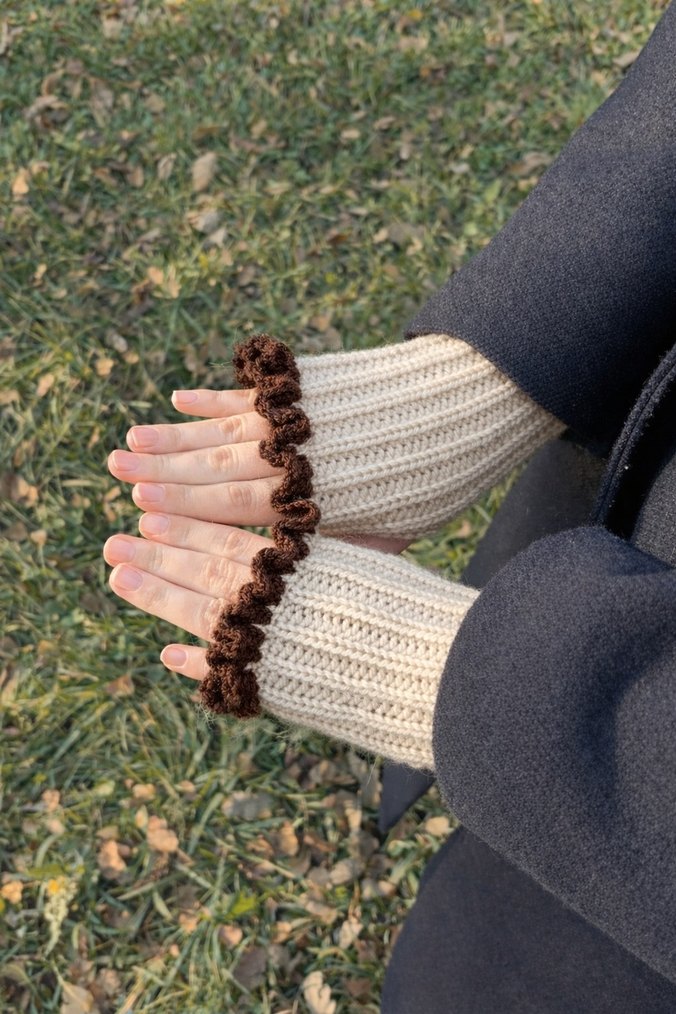 Bohem tarzda kahverengi örgü kadın eldiveni. Parmaksız, kahverengi fırfırlı detaylarıyla rahat ve retro bir görünüm sunar.