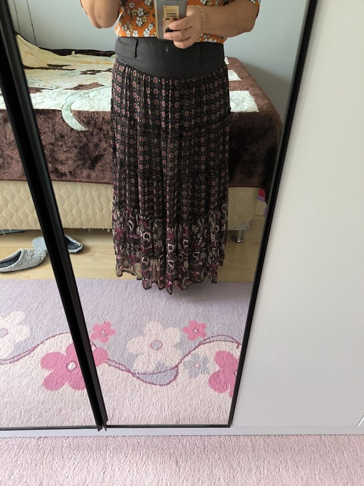 Bohem tarzda, kahverengi bağlama desenli, piliseli ve bol kesim uzun etek. Sentetik kumaştan, günlük kullanıma uygun.