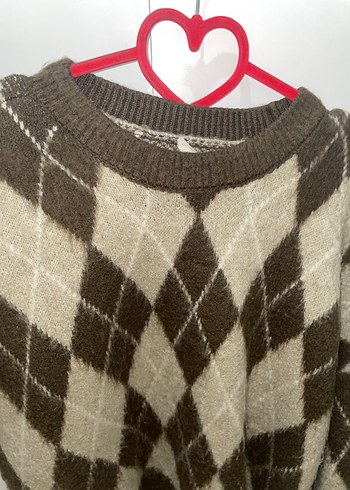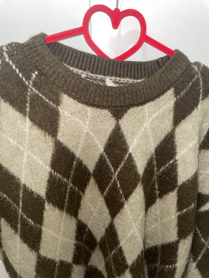 Bohem tarzda, kahverengi ve gri argyle desenli, uzun kollu, yuvarlak yakalı, rahat kesim kadın triko kazak. Rahat ve sıcak bir dokusu vardır.