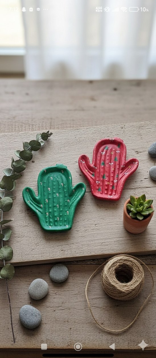 Bohem tarzda, kaktüs şeklinde yeşil ve kırmızı seramik tabaklar. Küçük dekoratif detaylara sahip, dekorunuza farklı bir hava katar.