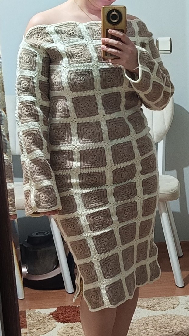 Kahverengi ve krem kareli örgü , uzun kollu, bohem tarzda elbise. ✨